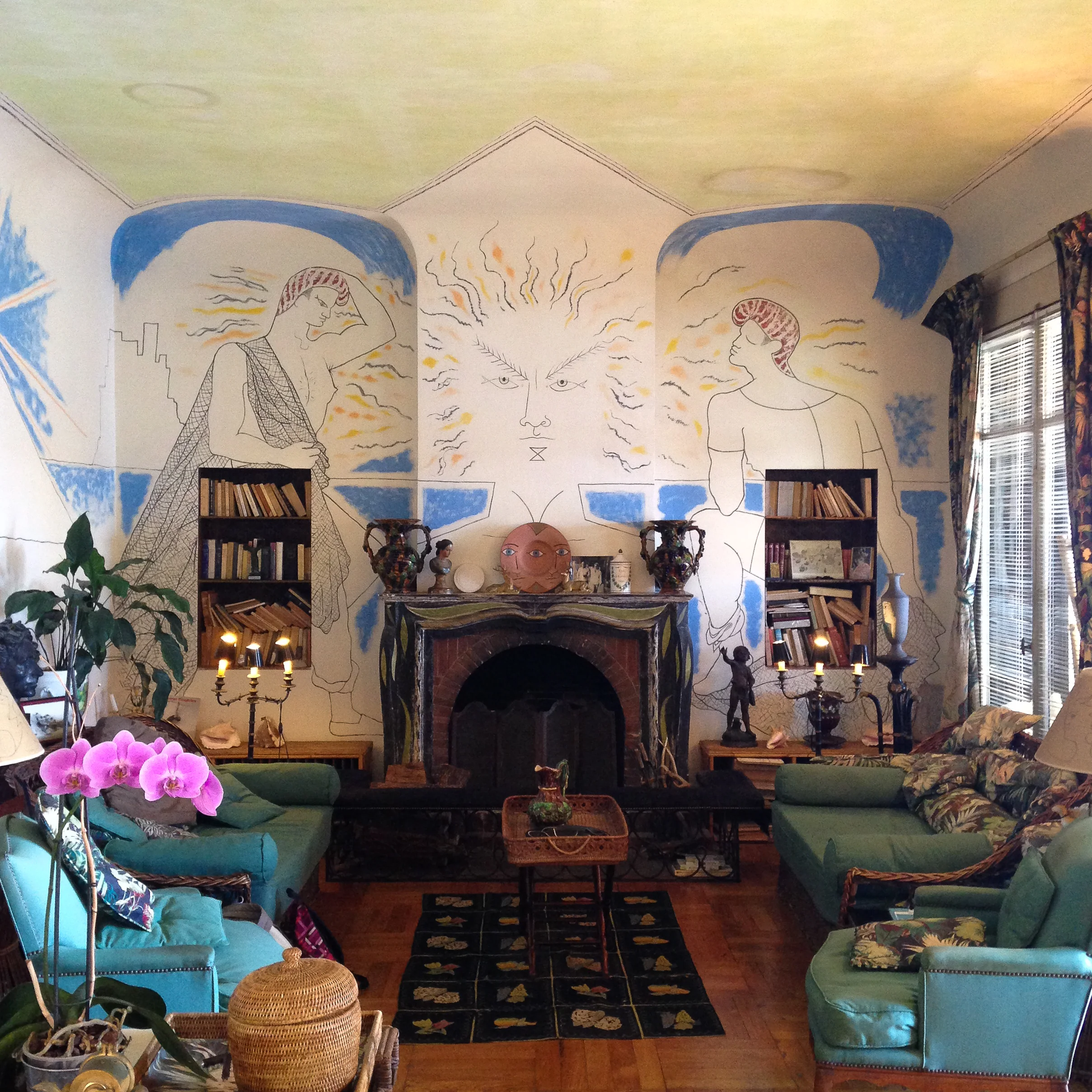 Francine delighted in the role of muse, while Cocteau let his imagination and painterly ambitions run wild, ‘tattooing,’ his own term, the very walls of the villa, first with only charcoal, and later with pastel and paint. He began first with the mantel. ‘Can I draw Apollo up there?’ I imagine little pushback. Apollo appeared, followed then by two sun gods, resembling the fishermen from nearby Villefranche, outfitted in striped berets. According to Francine’s daughter, Carole, “he found the silence of the walls terrible. Jean liked to say that he learned from Matisse that once you paint one wall, the other three look bare.” (NYTimes)